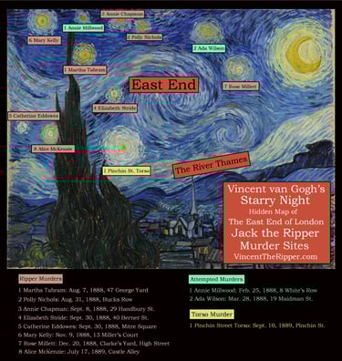 Vincent van Gogh painted a map of the East End of London representing his Ripper murder sites as stars hidden within his Starry Night painting.